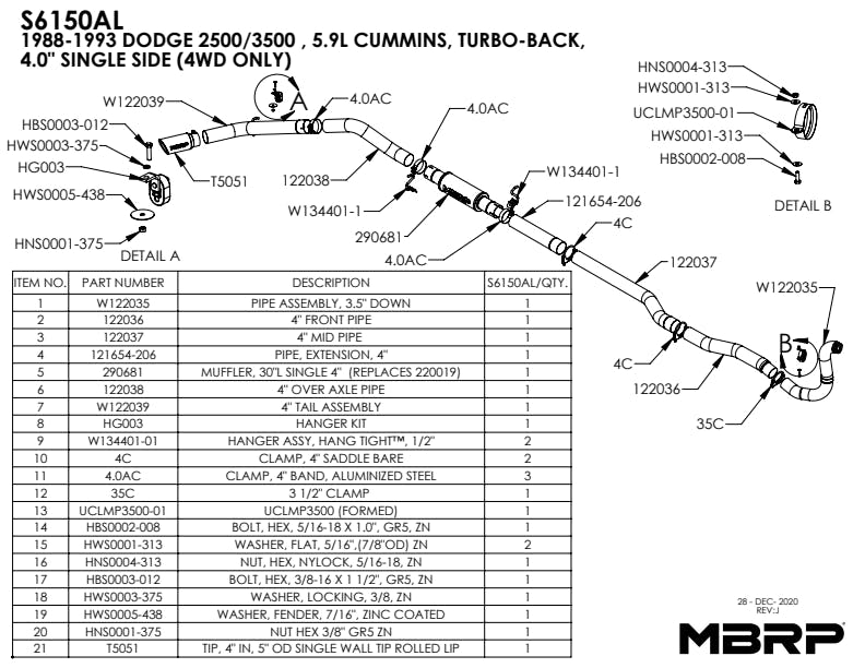 4in. Turbo Back. Single Side Exit. 4WD Only. Aluminized Steel.